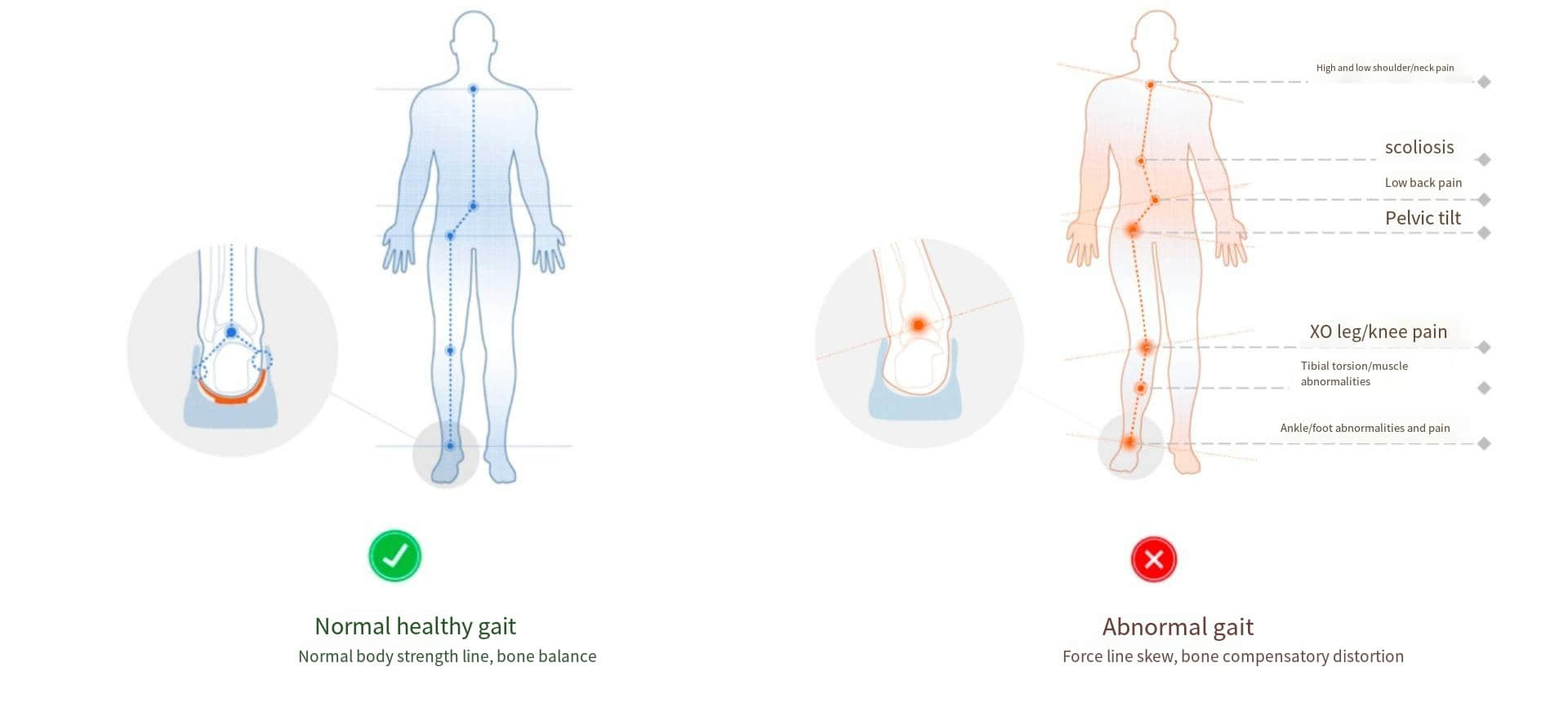 If the foot is not correct, the body's protection mechanism will prompt the body's joints to compensate instead, the ankle, knee, hip, pelvis, and spine, from the bottom to the top, are involved in compensation.