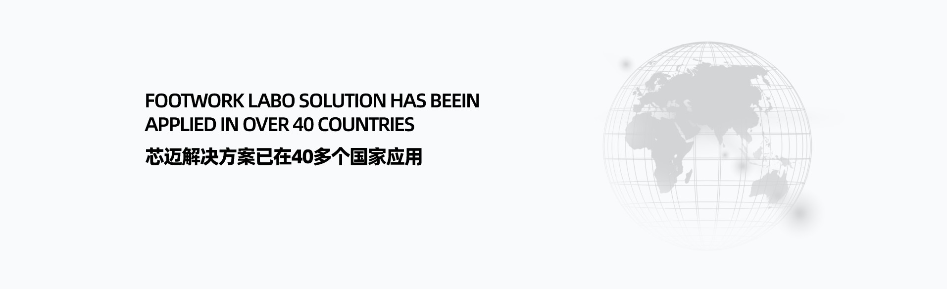 40+ FOOTWORK LAB芯迈® 已面向亚洲、欧洲、北美洲、南美洲、非洲等, 全球40多个国家输出从AI数智化检测到个性化产品定制的综合解决方案。 500+ 当前,FOOTWORK LAB芯迈® 已在全球建立解决方案服务场景超过500个, 涉及足科诊所、医学足部护理、运动康复、康复医疗、运动培训、运动品牌等领域。