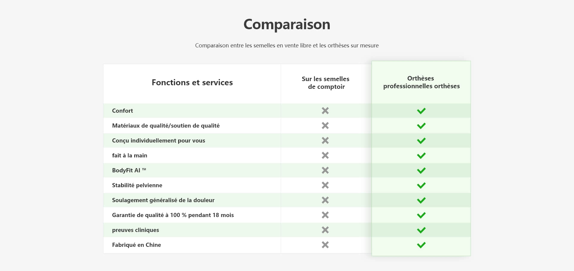 Seules les orthèses sur mesure peuvent soutenir les trois arches qui composent la voûte plantaire. Étant donné que nos orthèses sont personnalisées manuellement en fonction de votre scan du pied, aucune paire d'orthèses sur mesure n'est identique ! Des technologies innovantes telles que BodyFit AI™ ainsi que des matériaux de haute qualité et une technologie de numérisation rendent chaque paire d'orthèses unique - adaptée à la forme de votre pied - améliorant considérablement la qualité des orthèses tout en réduisant efficacement les douleurs dorsales et autres douleurs liées aux maladies des pieds.